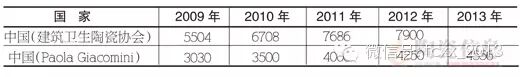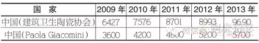 【注2】表中统计数据出自于Paola Giacomini,World Production and Consumption of Ceramic Tiles, Ceramic World Review,2014(8-10)46-61. 表中关于中国的数据与中国实际情况差别很大,此处将中国建筑卫生陶瓷协会的统计数据与原文的数据对比列出如下: