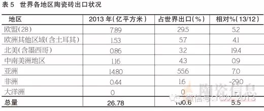 2013年世界陶瓷砖出口相对2012年增长5.5%,出口量从25.39亿平方米增长到26.78亿平方米。相对此前三年,2013年增长速率较低。仅非洲地区出口下降29%,下降到4.4亿平方米。2013年亚洲地区陶瓷砖出口14.90亿平方米,相对2012年13.93亿平方米,增长7%,是全球出口总额的55.6%;欧盟地区,由于西班牙、意大利瓷砖出口的进一步复苏,欧盟2013年出口瓷砖7.89亿平方米,增长5.2%;欧盟以外的欧洲地区出口从1.47亿平方米增加到1.53亿平方米,增长4.1%;中南美洲地区出口保持稳定的1.16亿平方米,增长0.9%;北美地区出口0.86亿平方米,增长19.4%,主要是由于墨西哥的出口增长。