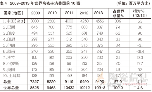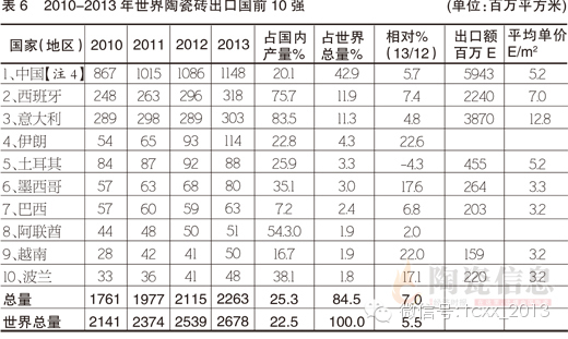 【注4】:表中统计数据出自于Paola Giacomini, World Production andConsumption of Ceramic Tiles, Ceramic World Review, 2014(8-10)46-61 .此文开始使用中国的出口数据,但没有使用中国的制造数据,所以我国瓷砖出口占总产量的20.1%。