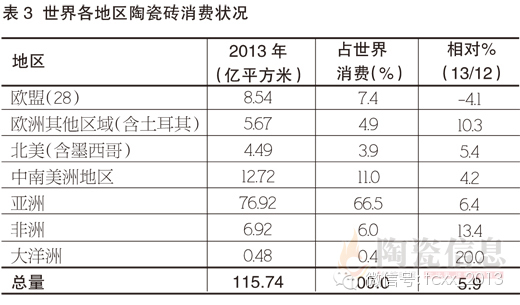 2013年世界陶瓷砖消费从2012年的109.32亿平方米上升到115.74亿平方米,增长5.9%。亚洲地区保持全球66.5%的市场需求,瓷砖消费从2012年的72.31亿平方米到2013年的76.92亿平方米,增长6.4%,低于产量的增长。中国、印度是瓷砖消费增长最大的贡献者,其他还有印度尼西亚、伊拉克、马来西亚与菲律宾。与2012年一样,唯一陶瓷砖消费持续下降的是欧盟地区,由8.9亿平方米下降到8.54亿平方米,下降4.1%(2012年下降5.8%),几乎整个欧盟国家的需求都在下降。与之相反的是非欧盟地区,瓷砖消费从5.14亿平方米上升到5.67亿平方米,增长10.3%。主要由于俄罗斯与土耳其的陶瓷砖消费增长;像2012年一样,2013年增长幅度最大的是非洲,增长13.4%,从6.1亿平方米增长到6.92亿平方米。非洲主要瓷砖消费国(埃及、尼日利亚、摩洛哥、阿尔及利亚、利比亚、南非、加纳、突尼斯、坦桑尼亚、肯尼亚)的消费都保持着增长。中南美洲瓷砖消费增长4.2%,从12.21亿平方米增长到12.72亿平方米,主要来自于巴西与阿根廷的瓷砖消费增长。北美地区瓷砖消费增长5.4 %,达4.49亿平方米。