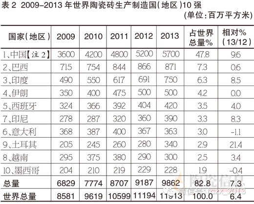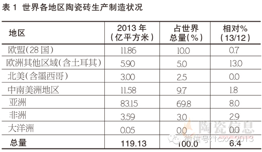 2013年世界陶瓷砖产量达119.13亿平方米[注1],相对2012年111.94亿平方米增长6.41%。数据显示在全球几乎所有陶瓷砖生产制造地区都保持了增长。