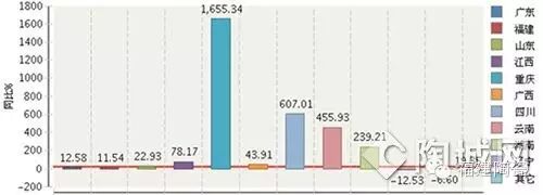 从出口增速看,在我国陶瓷砖出口主要地区中,重庆、四川、云南、湖南、江西出口额同比大幅增长,增速达70%以上;出口额居前两位的广东、福建出口增速均低于全国平均增速;在出口额前十地区中,辽宁为唯一负增长地区,详见图2。