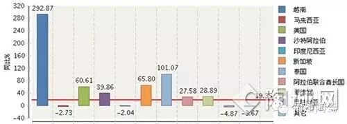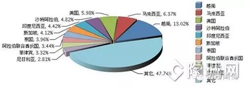 从出口增速看,对越南、泰国、新加坡、美国出口额大幅增长,其中出口越南同比增长292.87%,出口占比由上年同期第五跃升为首位。对印度尼西亚、马来西亚、尼日利亚出口额同比下降,降幅为个位数,详见图4。