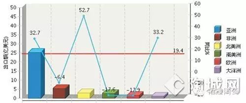 从出口增速看,对北美洲、大洋洲、亚洲出口额增幅均达30%以上;而对非洲、南美洲、欧洲出口均为负增长,其中南美洲、欧洲下降幅度较大,同比分别下降了17.60%、17.93%,详见图6。