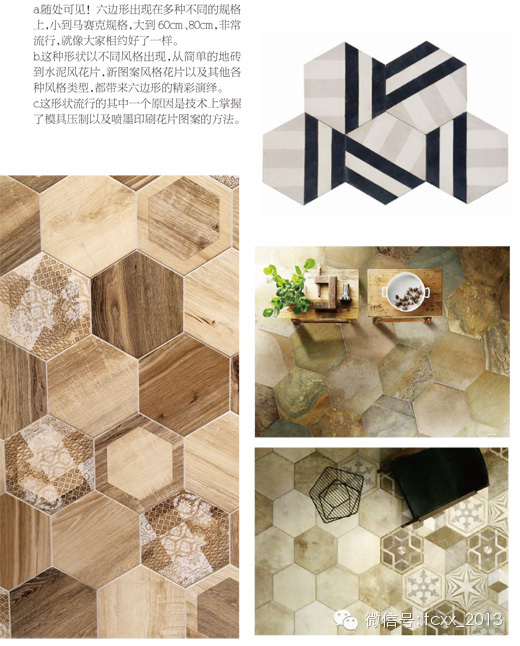 b.这种形状以不同风格出现,从简单的地砖到水泥风花片,新图案风格花片以及其他各种风格类型,都带来六边形的精彩演绎。
